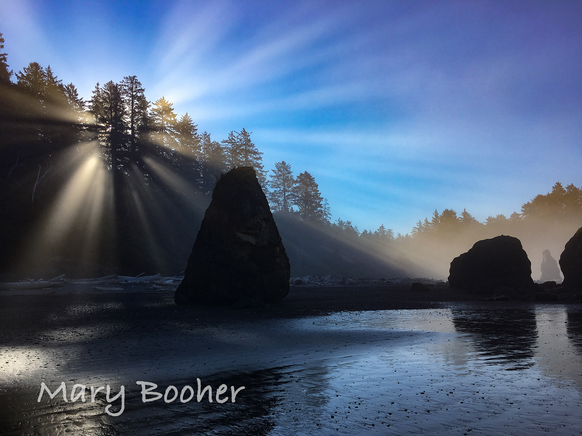 Typically hidden by fog and clouds, pure magic happens on a clear summer morning sunrise at Ruby Beach in the Olympic National Park.